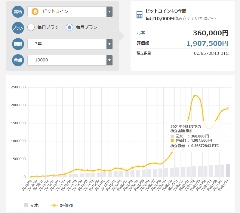 実際に2018年9月からの3年間、毎月1万円づつビットコイン(BTC)を積み立てた場合のシミュレーション結果を見てみたいと思います。