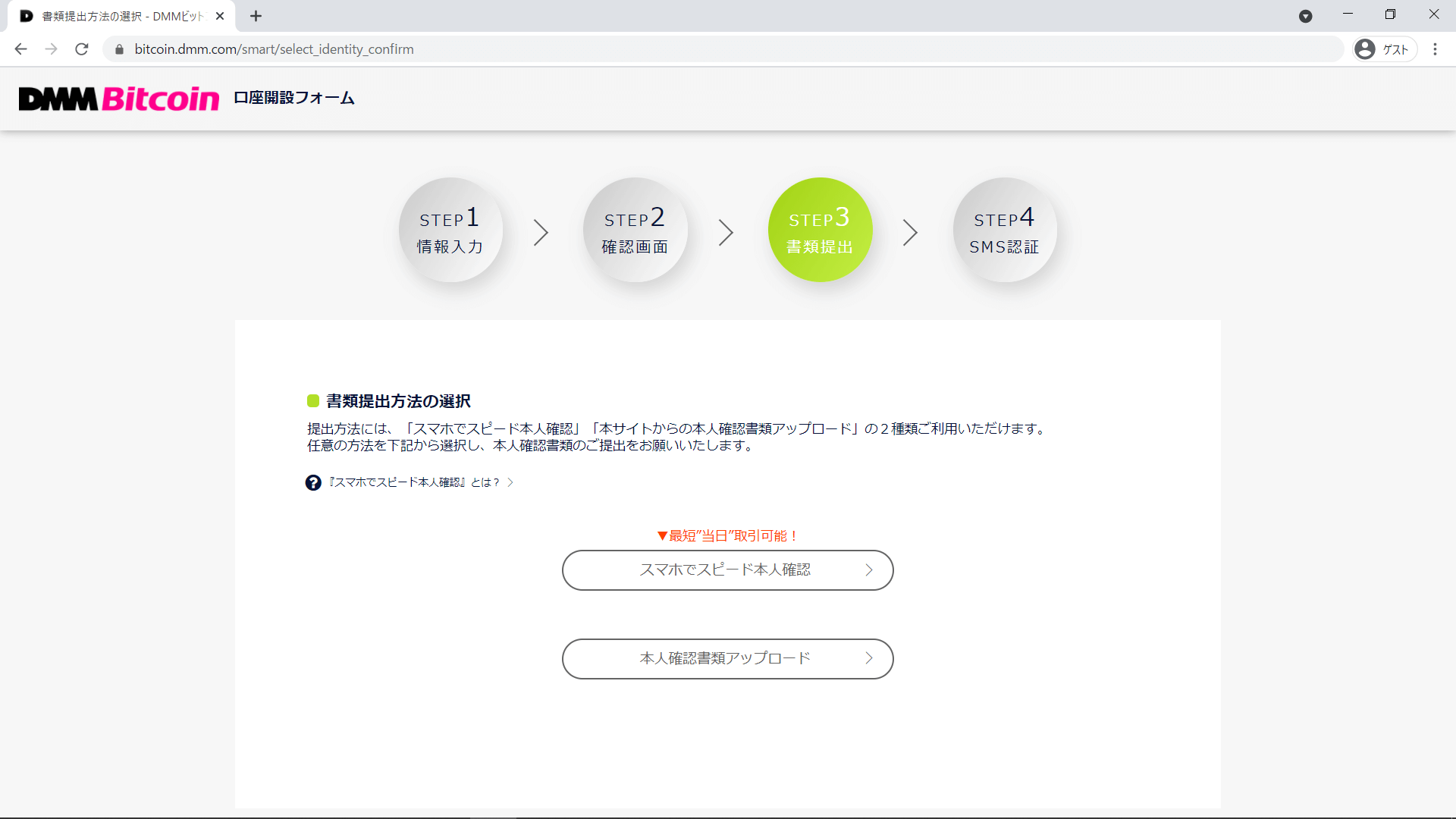『スマホでスピード本人確認』と『本人確認書類アップロード』がありますが、提出書類が1つで済み書類の受け取りの必要がない『スマホでスピード本人確認』が便利です。