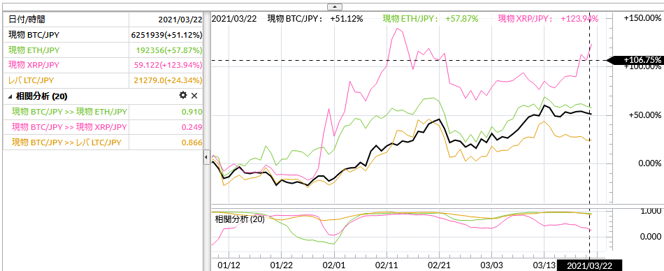 またDMM Bitcoinには、「相関分析」と「データ差分分析」という他の比較チャートにはない項目があります。