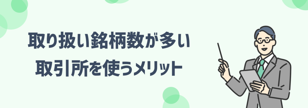 取り扱い銘柄の多い取引所を持っていおくことで、いざ注目銘柄が出てきた時に流れに乗り遅れることなく投資できます。
