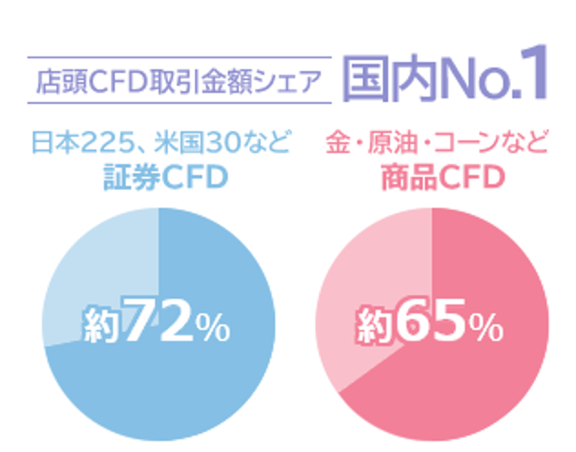 GMOクリック証券の調査によると、店頭CFDの取引金額では圧倒的に同社がシェアを獲得しているそうです。特に株価指数などの証券CFDでは7割以上のシェアを獲得しています。