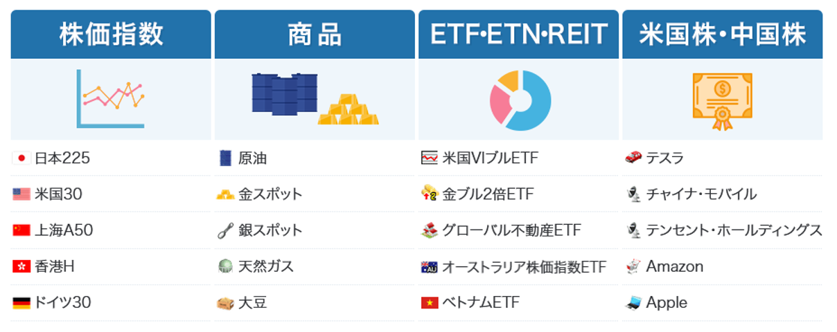 GMOクリック証券のCFDでは、30種類以上の株価指数(ETFを含む)の他に、原油や金、天然ガスなどの商品の他、VIX指数などのデリバティブ商品やテスラやアップル、アマゾンといった主要な米国株など※133の銘柄の取引を行うことが可能となっています。